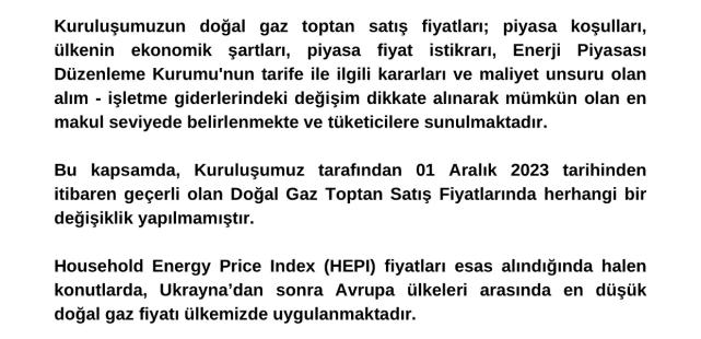 Kamu şirketi BOTAŞ (Boru Hatları ile Petrol Taşıma AŞ), 1 Aralık 2023 tarihi itibariyle geçerli olacak doğal gaz fiyatlarını açıkladı. BOTAŞ, Aralık ayı için doğal gaz fiyatlarına; her hangi bir değişiklik (zam ya da indirim) yapmadı.