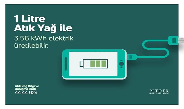 ''1 litre atık yağ ile 3,56 kWh (kilowatsaat) elektrik üretilebiliyor.'' Bu önemli bilgi paylaşımını, Petrol Sanayi Derneği (PETDER) yaptı. Tüketicilerin bu nedenle, mutfaktan fabrikaya atık yağları mutlaka biriktirmeleri gerekiyor, çevre ve insan sağlığı için. ve hemde, ekonomi için.
