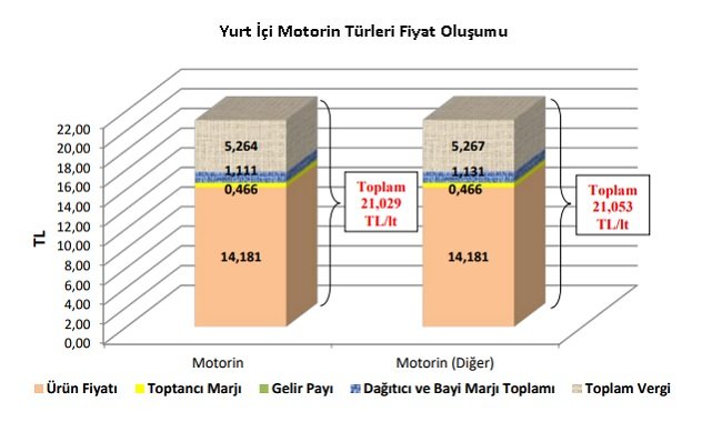 - Rapora göre 1 litre benzinin yüzde 28,24'ü vergiden oluşuyor (Gelir payı dahil). . 1 Litre motorinin ise yüzde 25,06'sı vergilere ait (Gelir payı dahil).