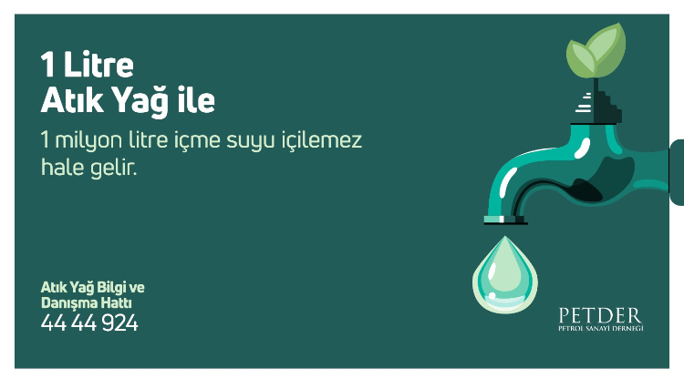 ‘Bir litre atık yağ ile bir milyon litre içme suyu içilemez hale gelmektedir. Bu zararın önüne geçebilmek için atık yağlarınızı PETDER’e teslim edin, milyonlarca litre içme suyunu kurtarın.’