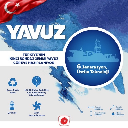 Türkiye'nin ikinci sondaj gemisi Yavuz, Türkiye'nin denizlerinde petrol ve doğal gaz aramaları için hazırlanıyor. Yeni alınan geminin en önemli özelliği, 6ıncı jenerasyon üstün teknoloji özelliklerine sahip olması. Gemi 12 bin 200 metre derinliğe kadar inip sondaj - arama yapabiliyor.