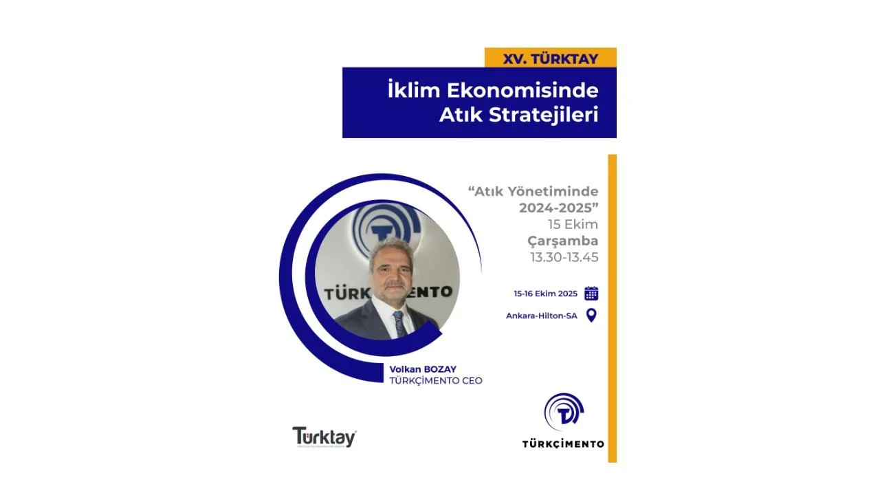 15.TÜRKTAY zirvesinde Altın Sponsor olarak yer alacak olan TÜRKÇİMENTO’nun CEO'su Volkan Bozay, zirve öncesi yaptığı açıklamada şunları söyledi: “İklim ekonomisinde atıklar artık bir sorun değil, enerjiye hammaddeye ve katma değere dönüşen stratejik bir kaynaktır. Çimento sektörü olarak bizler, bu dönüşümle hem 2053 net sıfır hedefimize katkı sağlıyor hem de tüm paydaşlarımızla birlikte döngüsel ekonomide öncü bir rol üstleniyoruz”.