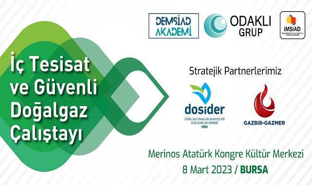 Doğalgaz, Enerji, Mekanik Mühendisliği Sanayici İşadamları Derneği (DEMSİAD), İnşaat Müteahhitleri Sanayici ve İş İnsanları Derneği (İMSİAD) ve Odaklı Grup işbirliği, GAZBİR-GAZMER ve DOSİDER stratejik partnerliğinde düzenlenecek “Bursa 2. İç Tesisat ve Güvenli Doğalgaz Çalıştayı” 8 Mart 2023 tarihinde Merinos Atatürk Kongre Kültür Merkezinde gerçekleşecek.