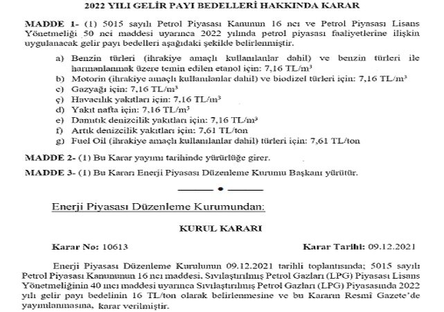 TABGİS: 'EPDK’nın petrol ve LPG piyasası faaliyetlerine ilişkin 2022 yılında uygulayacağı gelir payı bedelleri bugünkü Resmi Gazete’de yayımlandı (14.12.2021 tarihli Resmi Gazete