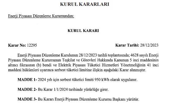 Enerji Piyasası Düzenleme Kurumu, 2024 yılı için elektrik piyasaları serbest tüketici limiti 950 kWh (kilowatsaat) olarak belirledi.