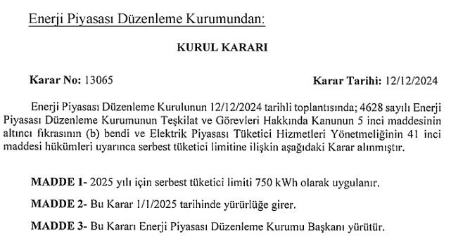 EPDK, 2025 yılı elektrik serbest tüketici limitini 750 kwh (kilowatsaat) olarak belirledi. EPDK Kurul Kararı Resmi Gazete de yayınlandı.