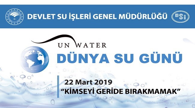 22 Mart Dünya Su Günü. Devlet Su İşleri Genel Müdürlüğü'nün (DSİ) verilerine göre Dünya Su Günü: Uluslararası Dünya Su Günü her yıl 22 Mart’ta tatlısu kaynaklarının önemine dikkat çekmek ve tatlısu kaynaklarının sürdürülebilir yönetimine odaklanılmasını sağlamak amacıyla kutlanmaktadır. 2019 yılının teması "Kimseyi Geride Bırakmamak"dır. Her yıl gerçekleştirilen bu kutlamaları Birleşmiş Milletler (UN) organize etmektedir.