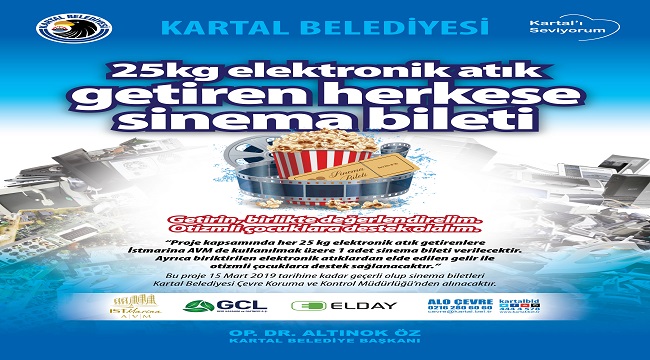 YENİ KAMPANYA: Elektrik ve Elektronik Geri Dönüşüm ve Atık Yönetimi Derneği (ELDAY) ve Kartal Belediyesi e-atıkların geri dönüşüm zincirine kazandırılmasını teşvik etmek ve bu konudaki farkındalığı artırmak için yeni bir kampanya başlatıyor. “Getirin birlikte değerlendirelim, otizmli çocuklara destek olalım”kampanyasıyla 15 Mart’a kadar elektronik atık toplayan herkese 1 adet sinema bileti hediye edecek, bu atıklardan elde edilen gelir ise otizmli çocuklar için harcanacak.