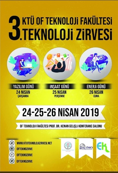 3. KTÜ (Karadeniz Teknik Üniversitesi) Of Teknoloji Fakültesi Teknoloji Zirvesi, 24-25-26 Nisan 2019 tarihlerinde Of'da yapılacak. KTÜ Enerji Kulübü sosyal medya hesabı üzerinden 'Detaylar için ofteknozirve sayfamızı takip etmeyi unutmayın, çok ENERJİK geliyoruz' başlığıyla etkinliği duyurdu.