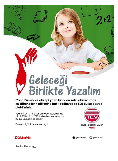 Canon, lise eğitimi gören kız öğrencilerin geleceğine umut olacak bir kampanyaya imza atıyor. Türk Eğitim Vakfı (TEV) iş birliğiyle hayata geçirdiği “Geleceği Birlikte Yazalım” isimli proje kapsamında Canon ev ve ofis tipi yazıcı alanlar kız öğrencilerin eğitimine destek oluyor. Canon lise eğitimi gören kız öğrencilerin senelik tüm eğitim masraflarını karşılayacak 500 burs veriyor.