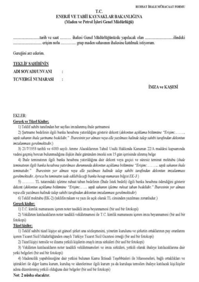 2 - Bu sahalar için başvurular sahanın ihalesinin yapılacağı tarihte ve 09:00-09:30 saatleri arasında Maden ve Petrol İşleri Genel Müdürlüğü, Konferans Salonunda İhale Komisyonuna doğrudan yapılacaktır. Posta veya diğer yollardan yapılan başvurular geçersiz sayılacaktır.