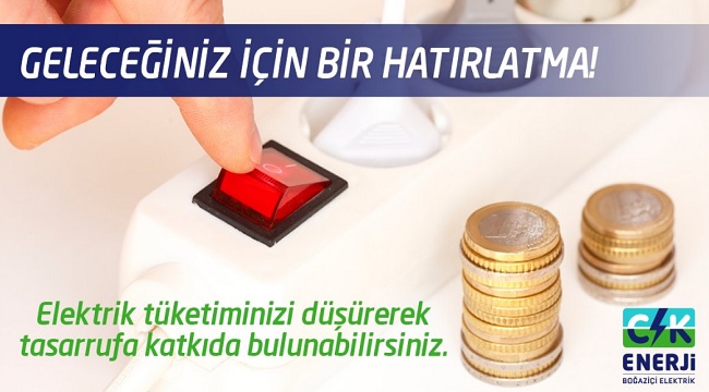 CK Enerji Boğaziçi Elektrik'in elektrik tasarrufu için sosyal medya bilgilendirmesi şöyle: Elektrikli aletler prize takılıyken açık durumda olmasalar bile enerji tüketimine devam ederler. Aç-kapa düğmeli uzatma kablolar tercih ederek ihtiyacınız yokken bir tuşla enerji kullanımını kesebilirsiniz.