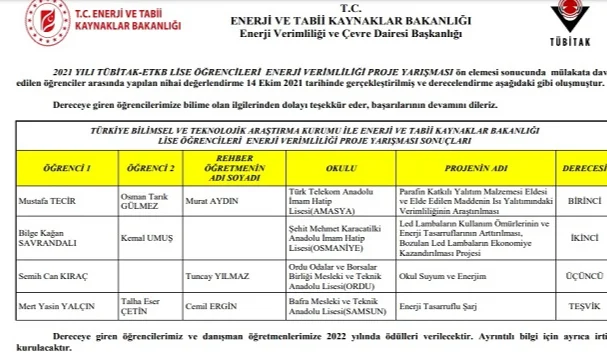 TÜBİTAK-ETKB Lise Öğrencileri Enerji Verimliliği Proje Yarışması Dereceye Giren Öğrencilerin Listesi