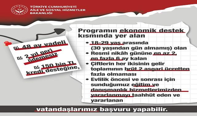 Proje kapsamında aile kurma yolunda ilk adımı atacak gençlerimizden başvurusu onaylanan çiftlere 48 ay vadeli, 2 yıl geri ödemesiz, 150.000 TL tutarında faizsiz kredi desteği sunulmasının yanı sıra evlilik öncesi ve sonrası eğitim ve danışmanlık hizmetleri sağlanacaktır.