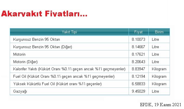Öte yandan 19 Kasım Pazartesi geçerli benzin - motorin fiyatları şöyle (Litre): Benzin (95 oktan) 8,10073 TL. Motorin (Normal) 8,17621 TL.Akaryakıt fiyat ayrıntıları için aşağıdaki tabloyu inceleyiniz.
