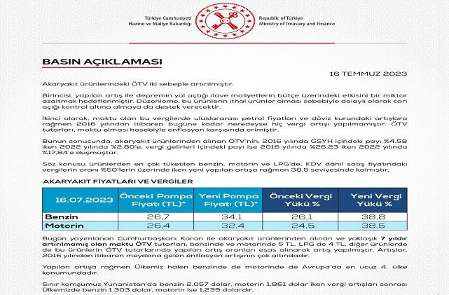 Hazine ve Maliye Bakanlığı, akaryakıt ürünlerine yapılan ÖTV artışının kamuoyunda yoğun tartışılması üzerine bir açıklama yaptı. Bakanlık açıklamasında, akaryakıt ürünlerinden alınan ÖTV artış nedenlerini açıkladı.