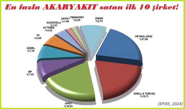 Enerji Piyasası Düzenleme Kurumu (EPDK), 2023 yılı Petrol (Akaryakıt) Sektör Raporunu yayınladı. Rapora göre geçen yıl toplam akaryakıt satışlarında yüzde 21,90 pay ile birinci, yüzde 19,71 pay ile Shell ikinci ve yüzde 18,93 pay ile de Opet üçüncü sırada yer aldı. Akaryakıt ana dağıtım şirketleri geçen yıl toplam 29,2 milyon ton ürün (benzin, motorin, fuel oil ve gazyağı) satışı gerçekleştirdi.