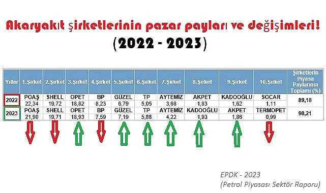 Enerji Piyassı Düzeneme Kurumu (EPDK), Petrol (Akaryakıt) Piyasası Sektör Raporu 2023'ü yayınladı. Şirketlerin pazar paylarına da yer verilen raporda Aytemiz, Opet, Güzel gibi bazı ana dağıtım şirketleri pazar paylarını artırırken; Petrol Ofisi, Shell, Socar gibi bazı şirketlerin pazar payları geriledi (geçen yıl, bir önceki yıla göre).