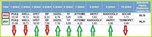 - Pazar payını artıran akaryakıt şirketleri: Aytemiz, Opet, Güzel, TP, Akpet, Kadoğlu.