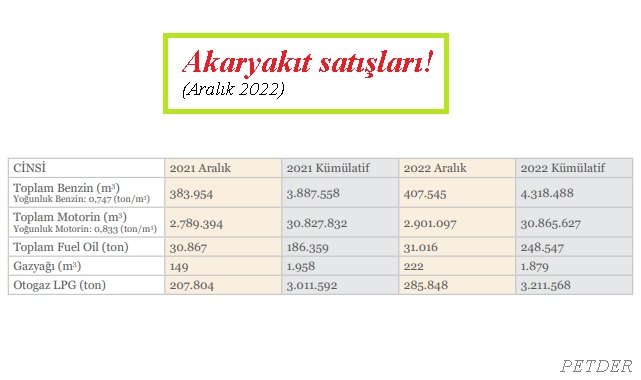 Petrol Sanayi Derneği (PETDER), Aralık ayı akaryakıt satış verilerini açıkladı. PETDER'in Aralık 2022 akaryakıt satışları ayrıntıları için aşağıdaki tabloya bakınız.