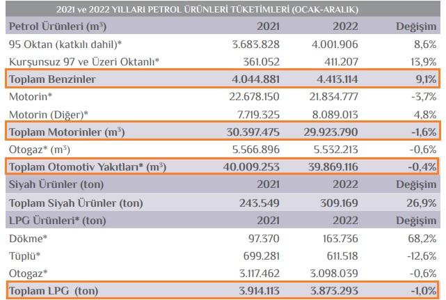 ''Akaryakıt sektörünün oluşturduğu toplam parasal büyüklük 2022 yılında, 2021 yılına göre dövizdeki ve uluslararası piyasada nihai ürün fiyatlarındaki artışın pompa satış fiyatına yansıması sonucunda, yüzde 185,1 oranında artmış ve 846,0 milyar TL olarak gerçekleşmiştir.''