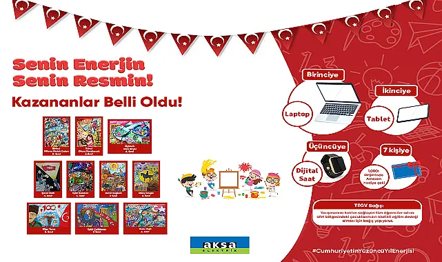 Aksa Elektrik, “Cumhuriyet’in Yüzüncü Yıl Enerjisi” temasıyla bu yıl beşinci defa düzenlediği “Senin Enerjin Senin Resmin” yarışmasının sonuçlarını açıkladı. Aksa Elektrik’in “Cumhuriyet’in Yüzüncü Yıl Enerjisi” temasıyla gerçekleştirdiği yarışmaya ilgi büyüktü. 5, 6, 7 ve 8’inci sınıf öğrencilerinin katılabildiği yarışmaya Türkiye’nin dört bir yanından başvuru geldi. Yarışmaya katılmak isteyen çocuklar çizdikleri resimleri Aksa Elektrik’in resmi Facebook ve Instagram sosyal medya hesaplarına mesaj göndererek paylaştı.