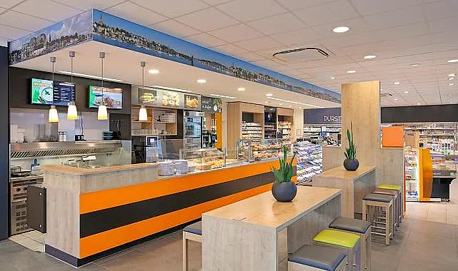 İstasyonun mağazası ve entegre bistro alanı birkaç nedenden dolayı göze çarpıyordu. Mağazada, müşteriler LED aydınlatmalı bir ödeme alanı ve kasanın ve bistronun tüm tezgah alanının üzerindeki gölgelik üzerindeki yerel Flensburg silüeti ile karşılanıyor. Bu bölgesel dokunuşlar alışveriş deneyimini kişiselleştiriyor ve bu durum bina genelinde devam ediyor.