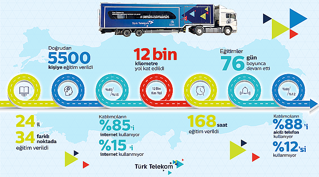 İkinci etabını tamamlayan Türk Telekom Eğitim Tırı içerisinde akıllı tahta, bilgisayar, tablet ve akıllı telefon gibi cihazlarla verilen eğitimlerde 2017 ve 2018 yılı toplamında yaklaşık 11 bin kişi eğitim aldı. İki yılda toplam 39 ilde, 49 farklı lokasyonda konumlanan Türk Telekom Eğitim Tırı, geride bıraktığı 2’nci yılında Türkiye içinde 25 bin kilometreden fazla yol kat ederek, Avrupa ile Asya arasında köprü olan 8 bin kilometrelik Tarihi İpek Yolu’nun 3 katı kadar mesafeye ulaştı.
