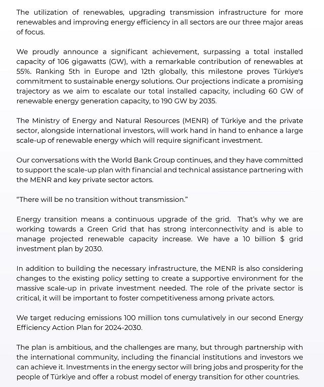 ''I attended the energy transition panel hosted by the World Bank with a special focus on Türkiye at the COP28 Summit in Dubai via videoconference and discussed our transition plan.''