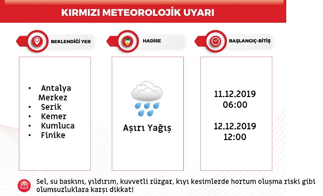 Meteoroloji Genel Müdürlüğü (MGM), Antalya için 'Kırmızı Meteorolojik Uyarı' yaptı. Kırmızı Meteorolojik Uyarı, Çarşamba ve Perşembe günleri (11-12 Aralık 2019) için yapıldı.