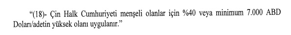 Karar, Çin Halk Cumhuriyeti Menşeli olanlar için yüzde 40 veya minumum 7.000 ABD dolar/adetin üstünde olan araçlariçin uygulanacak. Cumhurbaşkanı Kararı, yayınlanmasıyla birlikte yürürlüğe girdi.