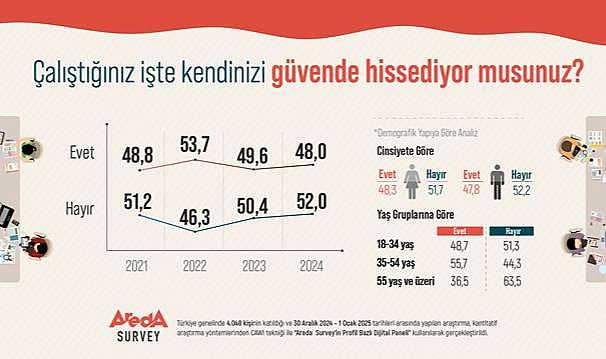 Areda Survey’in Türkiye genelinde 4.048 kişinin katılımıyla gerçekleştirdiği araştırmaya göre, Türk halkının yüzde 52’si iş yerinde kendini güvende hissetmediğini, yüzde 48’i ise güvende hissettiğini belirtiyor.