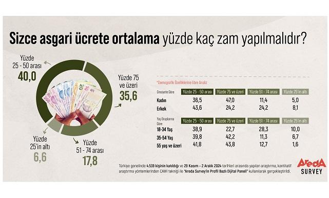 Areda Survey araştırma şirketinin Türkiye genelinde 4.539 kişiyle gerçekleştirdiği araştırmaya göre, vatandaşın yüzde 40’ının asgari ücrete zam beklentisi yüzde 25 ile yüzde 50 arasında. Katılımcıların yüzde 35,6’sı ise asgari ücrete yüzde 75 ve üzerinde bir zam yapılması gerektiğini düşünüyor. Asgari ücrete yüzde 51 ila yüzde 74 arasında bir zam yapılması gerektiğini düşünenler toplumun yüzde 17,8’ini kapsıyor. Yüzde 25’in altında bir zammın yeterli olacağını düşünenlerin oranı ise yüzde 6,6 olarak araştırmaya yansıyor.