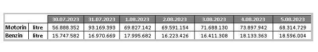 Resmi verilere göre Türkiye aşırı sıcaklarda günlük ortalama 69-70 milyon litre civarı motorin ve 16-17 milyon litre civarı da benzin tüketti. Türkiye bu dönemlerde akaryakıta zamların geldiği günlerde ise akaryakıt satışlarını artırdı.