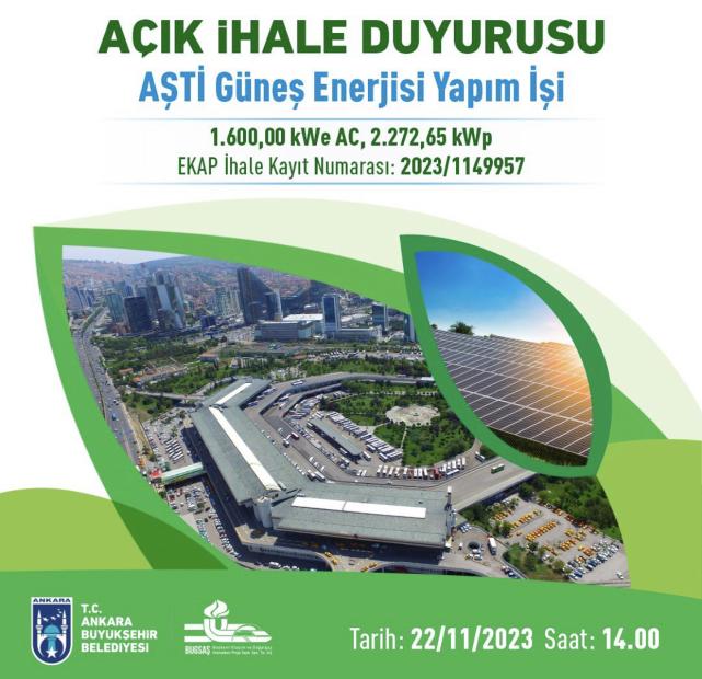 Ankara Büyükşehir Belediyesi (ABB), "BUGSAŞ AŞTİ Güneş Enerjisi Yapım İşi" başlıklı ihale duyurusu yaptı. İhale duyurusu (EKAP İhale Kayıt Numarası: 2023/1149957) ayrıntılarını aşağıda okuyabilirsiniz.
