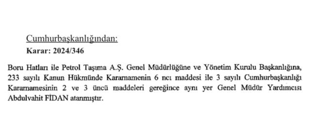 Kamu şirketi Boru Hatları İle Petrol Taşıma AŞ (BOTAŞ) Genel Müdürüğü ve Yönetim Kurulu Başkanlığı görevine Abdulvahit Fidan atandı. Atamayla ilgili Cumhurbaşkanlığı kararı, bugünkü Resmi Gazetede yayınlandı (5 Ekim 2024 tarih ve 32683 sayılı Resmi Gazete, Atamalar Bölümü).