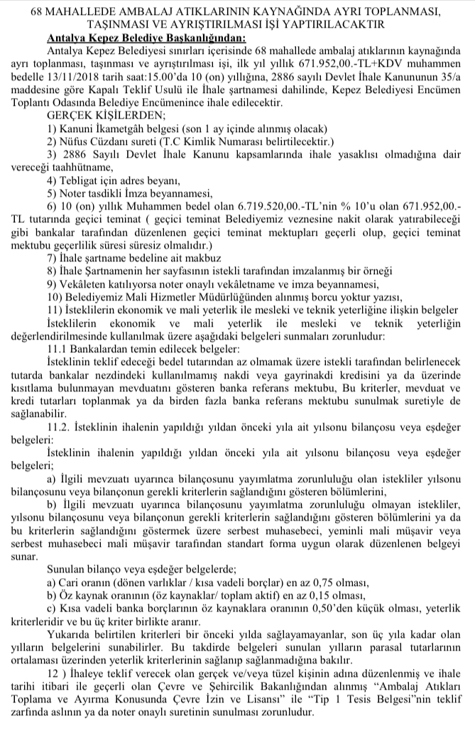 Antalya’da ambalaj atıklarını toplamak içğn ihale yapılacak. İhale duyurusu şöyle: