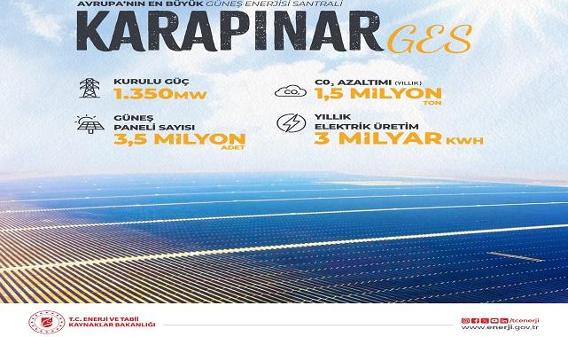 ''Avrupa’nın en büyüğü olan Karapınar Güneş Enerjisi Santrali 3,5 milyon güneş paneli ile yıllık 3 milyar kilovatsaat elektrik üretebiliyor.''