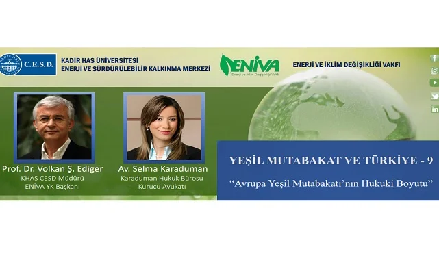 'Kadir Has Üniversitesi Enerji ve Sürdürülebilir Kalkınma Merkezi (CESD) ile Enerji ve İklim Değişikliği Vakfı (ENİVA) tarafından düzenlenen “Yeşil Mutabakat ve Türkiye-9” etkinliği, 1 Şubat Salı günü 18:00-19:00 arasında gerçekleştirilecektir.
