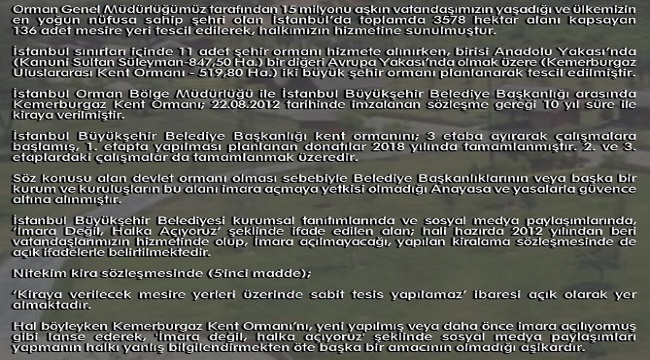 Tarım ve Orman Bakanlığı, İstanbul Kemerburgaz Kent Ormanı’nı, ‘İmara Değil, Halka Açıyoruz’ başlığı altında İstanbul Büyükşehir Belediyesi sosyal medya paylaşımlarında, bazı basın yayın organlarında ve tanıtımlarda yer alan haberler üzerine basın açıklaması yaptı.