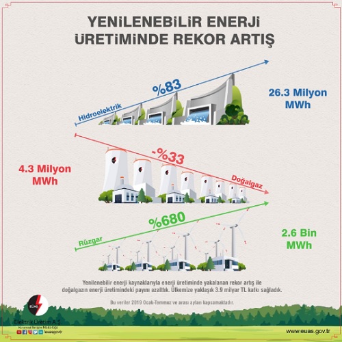 Kamu şirketi Elektrik Üretim AŞ (EÜAŞ) 'Yenilenebilir enerji üretiminde rekor artış' başlığıyla yeni bir bilgi paylaşımı yaptı. EÜAŞ yaptığı bilgi paylaşımında (Ocak-Temmuz 2019 dönemi) yenilenebilir enerjiyle elektrik üretiminde % 83 artış yaşanırken doğal gazla elektrik üretimindeki artış ise -% 33 oldu. Aynı dönemde rüzgar enerjisindeki artış ise % 680 olarak gerçekleşti.