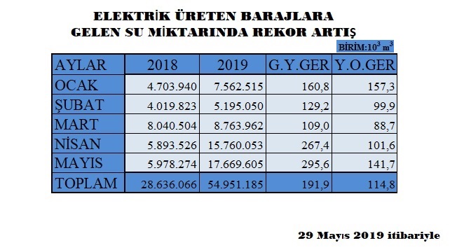 Elektrik üreten barajlara gelen su miktarında rekor artış yaşanıyor. Türkiye Elektrik Üretim AŞ (TEİAŞ) verilerine göre, elektrik üreten barajlara gelen su miktarında hem geçen yıla göre ve hemde yıl ortalamasında artış var. HES'lere gelen su miktarındaki artış, 2018-219 yılları karşılaştırmasında (Ocak-Mayıs dönemi, 29 Mayıs itibariyle) yüzde 191 artış yaşandı (Ayrıntılı bilgi için, haberin sonundaki tabloya bakınız).