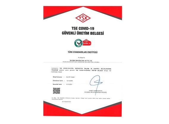 Sanayi ve Teknoloji Bakanlığı’na bağlı Türk Standartları Enstitüsü, koronavirüsle mücadele kapsamında gerekli düzenlemeleri yaparak önlemlerini alan şirket ve kurumları güvenli üretim belgesi ile tescillemeyi sürdürüyor. Baymak, son teknolojilerle donatılmış üretim tesislerinde aldığı sıkı güvenlik önlemleri ile kendi sektöründe COVID-19 Güvenli Üretim Belgesi’ni almaya hak kazanan öncü şirketlerden biri oldu.