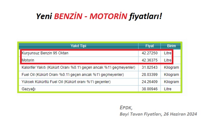 EPDK verilerine göre (26 Haziran 2024, Çarşamba); son larla birlikte 1 litre benzin 42,27250 liradan ve motorinde 42,36375 liradan satılıyor (Bayi tavan fiyatla). Bu fiyatlarla çok küçük farkla benzin ve motorin, akaryakıt istasyonlarnda aynı fiyattan satılmaya başlandı.