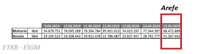 Arefe günü motorin tketimi ise azaldı. Arefe günü motorin satışları toplam 68,4 milyon litre oldu. Bu rakam, normal günlük tüketim olan 76-79 milyon litre civarı olan tüketimin yaklaşık 10 milyon litre altına geriledi.