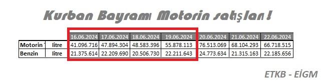 Kurban Bayramı ve Arefe, ''gün gün '' benzin ve motorin satışları için aşağıdaki tablolara bakınız...