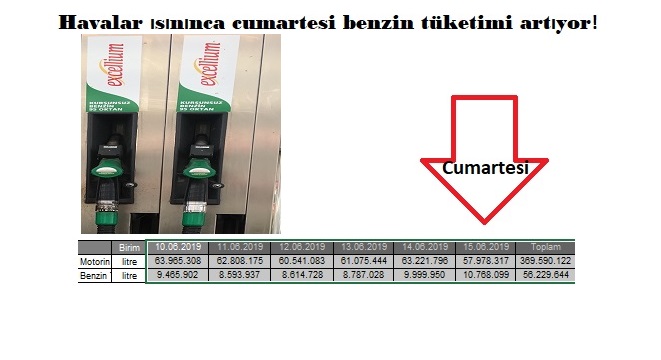 Resmi akaryakıt tüketim verilerine göre Türkiye'de haft aiçi motorin tüketimi, hafta sonu benzin tüketimi artıyor. Enerji İşleri Genel Müdürlüğü (EİGM) Enerji İstatistik Bülteni son verilerine göre, 10-14 Haziran 2019 arası günlük ortalama 62-63 milyon litre motorin tüketilirken bu rakam hafta sonu (15 Haziran Cumartesi) 57 milyon litre rakamlarına geriliyor. Buna karşın aynı dönemde günlük benzin tüketimi 8-9 milyon litre iken bu rakam cumartesi (15 Haziran) 10 milyon litreyi geçti.