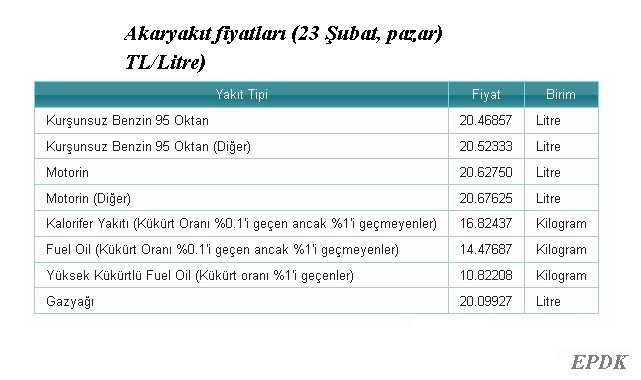 Ham petrol fiyatlarındaki son dalgalanmalar, benzin ve motorin fiyatlarını eşitledi. İşte, Enerji Piyasası Düzenleme Kurumu (EPDK) verilerineson günlük benzin ve motorin fiyatları şöyle (26 Şubat 2023 pazar günü, Litre): Benzin (95 oktan kurşunsuz) 20,46 TL. Motorin (normal) 20,62 TL.
