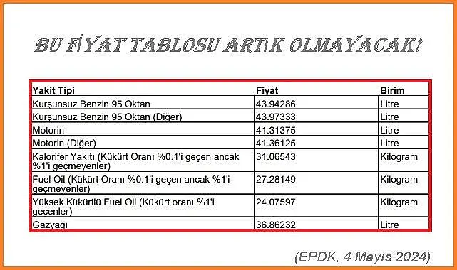EPDK, her gün yayınladığı Akaryakıt ürünleri fiyat bülteninde yer alan farklılaştırılmış ürün fiyatlarıda 15 Mayıs 2024 tarihi itibariyle sonlanmış olacak.