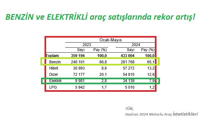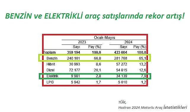 Son dönemde benzinli ve elektrikli araçlara duyulan ilgi, satış rakamlarına da yansıdı. Ocak - Mayıs 2024 döneminde en fazla satılan araç sıralamasında 'benzinli ve elektrikli araçlar rekor kırdı.